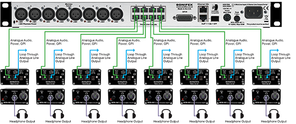 The AVN-PM8 can be combined with multiple Sonifex AVN-HA1 headphone amplifiers to provide 8 separate headphone signals where each headphone amplifier can be sent a separate feed, mixed from any physical mic input or stream input. On portal units with RJ45 outputs, an AVN-HA1 headphone amplifier can be used to listen to the outputs, with the portals providing power and audio signals. The switches on the front panel of the AVN-HA1 can be used as another GPI for muting the output.