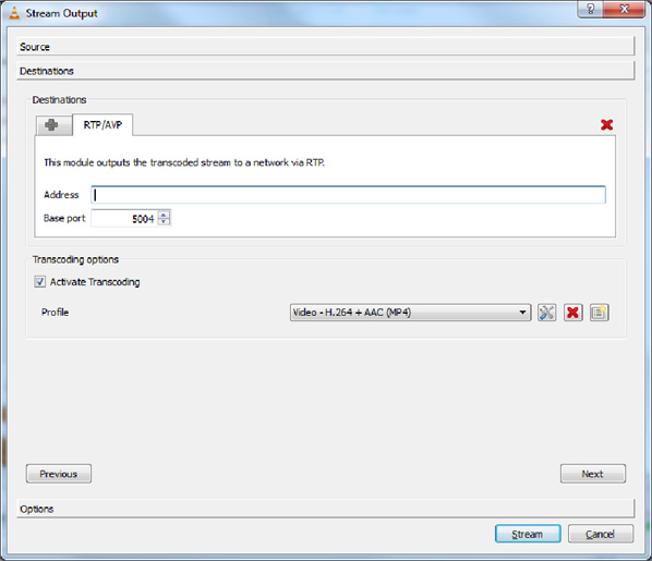 Click next change the destination to RTP Audio/Video profile and click add next to the destination.