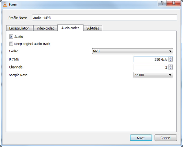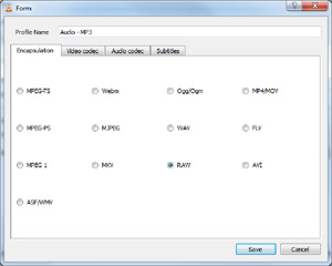 Set encapsulation to RAW set the bitrate to 128, 160, 192, 256 or 320k.