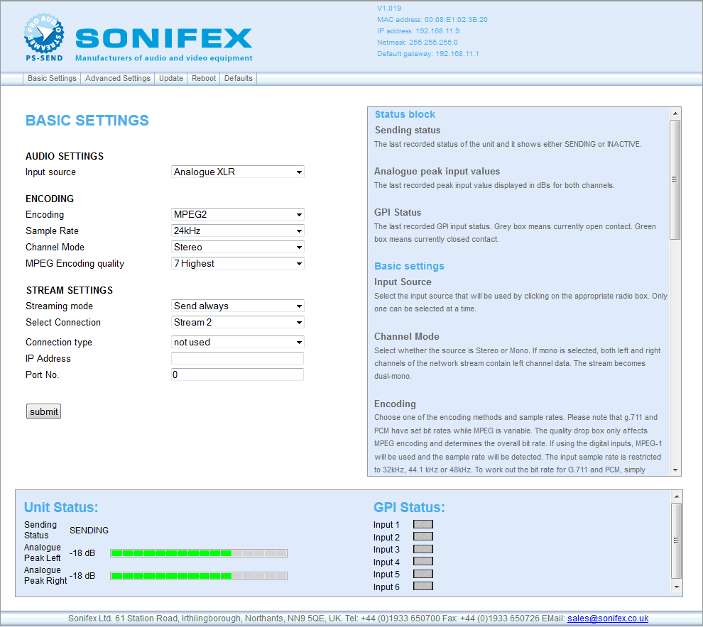 To connect to the Icecast server installed on the test PC we would enter the relevant port number (here 8000) the IP address of the PC Icecast is running on and click submit to apply these settings.