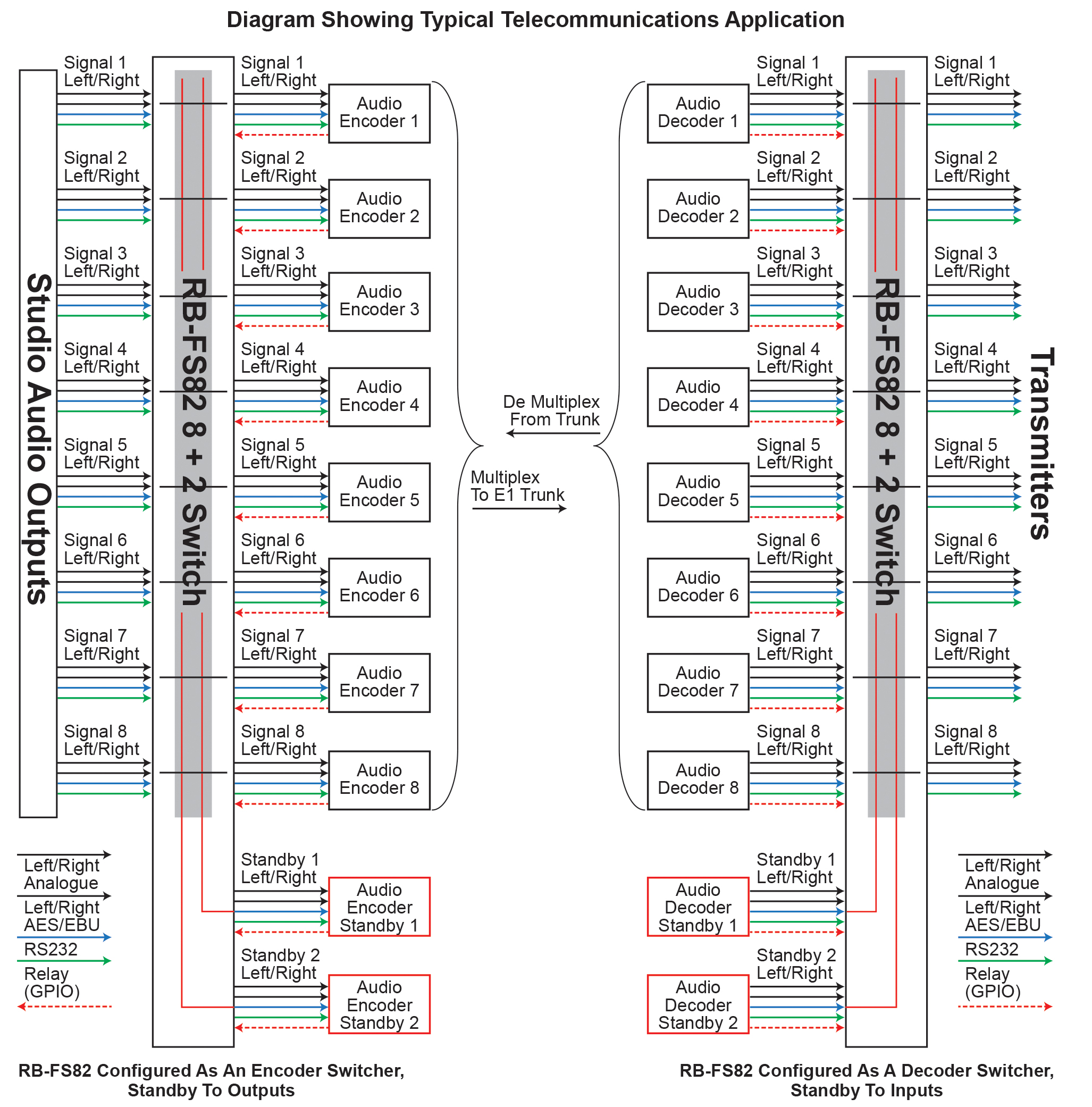To ensure the passive nature of the device, switching is determined by alarm (General Purpose) inputs, with this alarm signalling in turn being normally provided by the encoder or decoders (or other devices) at site. Recognising the mission critical nature of the system, a high grade of relay is used in the RB-FS82.